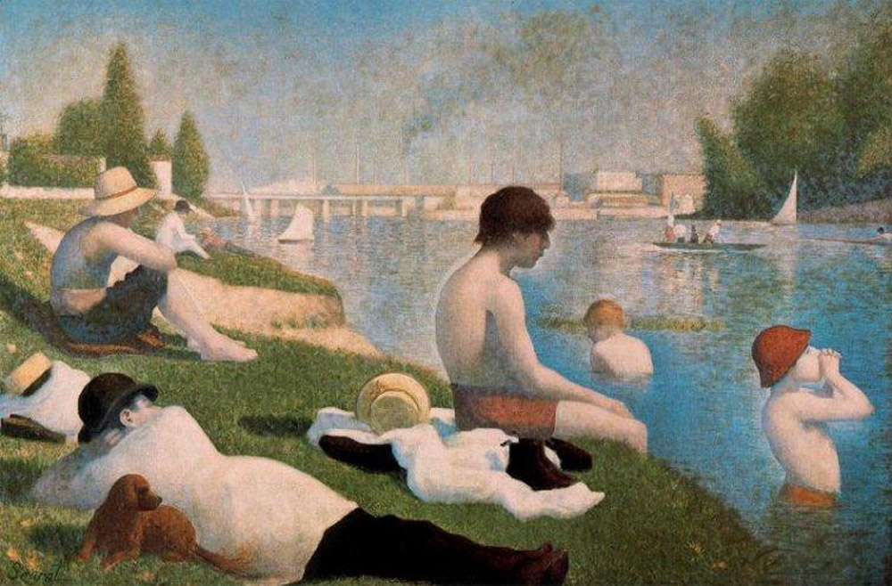 Este procedimiento quedar� de manifiesto en su obra "Tarde de domingo en la isla de La Grande Jatte" que constituye el manifiesto del Divisionismo y en el que utiliza pinceladas uniformes de color puro que el espectador mezcla �pticamente y no de la propia paleta del pintor. Si observamos detenidamente esta obra, apreciamos c�mo las formas, las figuras aparecen r�gidas� tanto los burgueses como el agua o los �rboles. Pareciera que todo vibrara pero sin ning�n movimiento, similar a una inerte geometrizaci�n. La naturaleza ya no es el objeto a representar, sino el ser humano, la sociedad� concebidos como aut�matas, condicionados a los postulados de la ciencia.