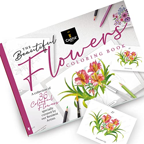 Castle Arts Flowers - Libro para colorear | 36 hermosas flores que inspiran la atención plena curadas por artistas internos | Con guía de referencia de color | Papel de grado artista no se muestra | Tamaño A4 de paisaje enmarcado