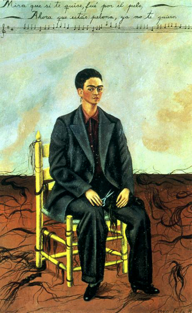 Durante esta �poca de soledad, traba Frida muy intensamente. Puesto que no quer�a aceptar el apoyo econ�mico de Rivera, intentaba ganarse su sustento con la pintura. La nueva independencia de la artista es tambi�n rematizada en el "Autorretrato con pelo cortado". En lugar de con un atuendo femenino, como en la mayor�a de sus retratos, la encontramos aqu� vestida con amplio y oscuro traje de caballero. Los largos cabellos acaban de ser cortados con una tijera que a�n se encuentra en sus manos. Una de las trenzas reposa sobre su muslo, el resto de los mechones se enredan entre s�, como si tuvieran vida propia, sobre el suelo de toda la habitaci�n, alrededor de las patas y traviesas de las sillas. El verso de una canci�n escrito en la parte superior revela la raz�n del hecho: "Mira que si te quise, fue por el pelo. Ahora que est�s pelona, ya no te quiero". Frida que, como en el verso, se sent�a amada s�lo gracias a sus atributos femeninos, decidi� deshacerse de ellos y deponer la imagen femenina que de ella se esperaba. Se desembaraz� de su pelo, atributo de belleza femenina como ya hab�a hecho en 1934/1935 despu�s de su separaci�n de Rivera.