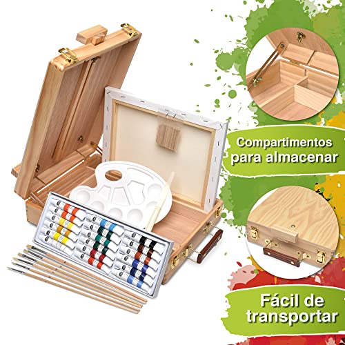 CABALLETE MALETÌN CON COMPARTIMENTOS Gracias a sus compartimentos ofrece mucho espacio para susu utensilios de pintura. caballete de madera Ideal para empezar en el mundo de la pintura