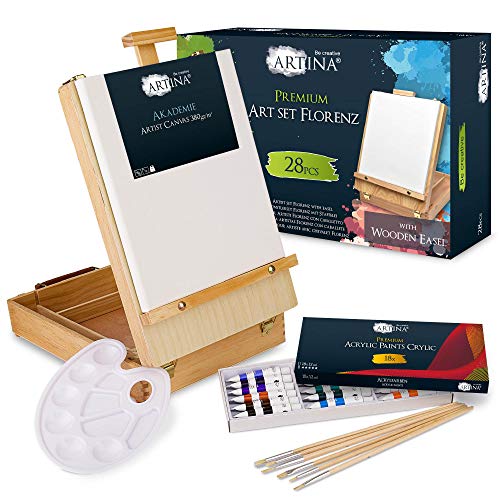 SET DE 28 PIEZAS Este set de 28 piezas es ideal para iniciantes en la pintura para niños : 1 caballete -maletín de mesa, 18×12 colores acrílicos, 6 pinceles un lienzo de 24×30 cm preparado para usar. 1 paleta de mezclas y 1 cuchillo