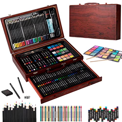 ★【¡Artesanías increíbles! No solo juego de arte: estos suministros de arte de dibujo son bastante elegantes con un estuche de suministros de arte de madera, cada lado revela muchos elementos de dibujo, lápices de colores afilados previamente, Lápiz de acuarela, crayones, pastel de acuarela: simplemente coloque el pastel elegido en la paleta rectangular, coloque un un poco de agua en su pincel, haga dibujos en el cuaderno usando varias herramientas de dibujo, diviértase pintando para los niños.