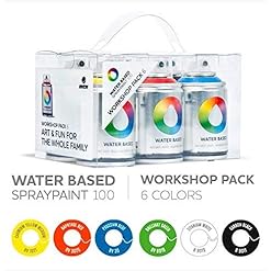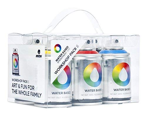 Pack 6 MTN Water Based Workshop Sprays 100ml - Pintura base agua, acabado mate y soluble al agua. Inodoro, apto para interior y exterior. Válvula anti-obturación Formato ergonómico de 100ml. Reducción de la sensación de fatiga al pintar en espacios con poca ventilación. Permite pintar sobre cualquier superfície incluso el poliestileno expandido (porexpan). Las manchas frescas se pueden limpiar con agua y jabón si se actúa durante los primeros 15-20 minutos.