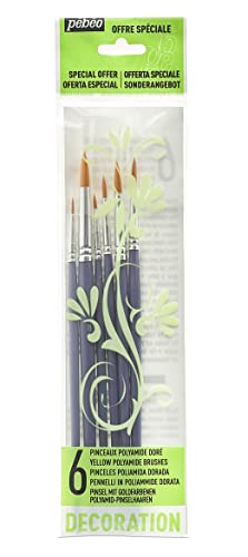 Uso: Este paquete Pébéo aficiones creativo 6 cepillos Poliamida ronda de oro N º 000 , 0, 2 , 4 , 6, 8 fibras de poliamida amarillo utilizados en la fabricación de estos cepillos son absorbentes y duradero .. No tienen la capacidad de mantener el mismo color que las fibras naturales , pero son más resistentes . Su flexibilidad hace perfectos para la aplicación de colores licuados . Estos cepillos tienen unos casquillos de acero inoxidable y mango de madera.