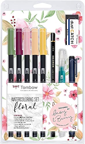 5 rotuladores ABT Dual Brush con tonos florales, rotus de punta fina para detalles y punta flexible de pincel para aplicar el color | 1 pincel Water Brush con depósito rellenable para extender, suavizar y difuminar los colores con agua
